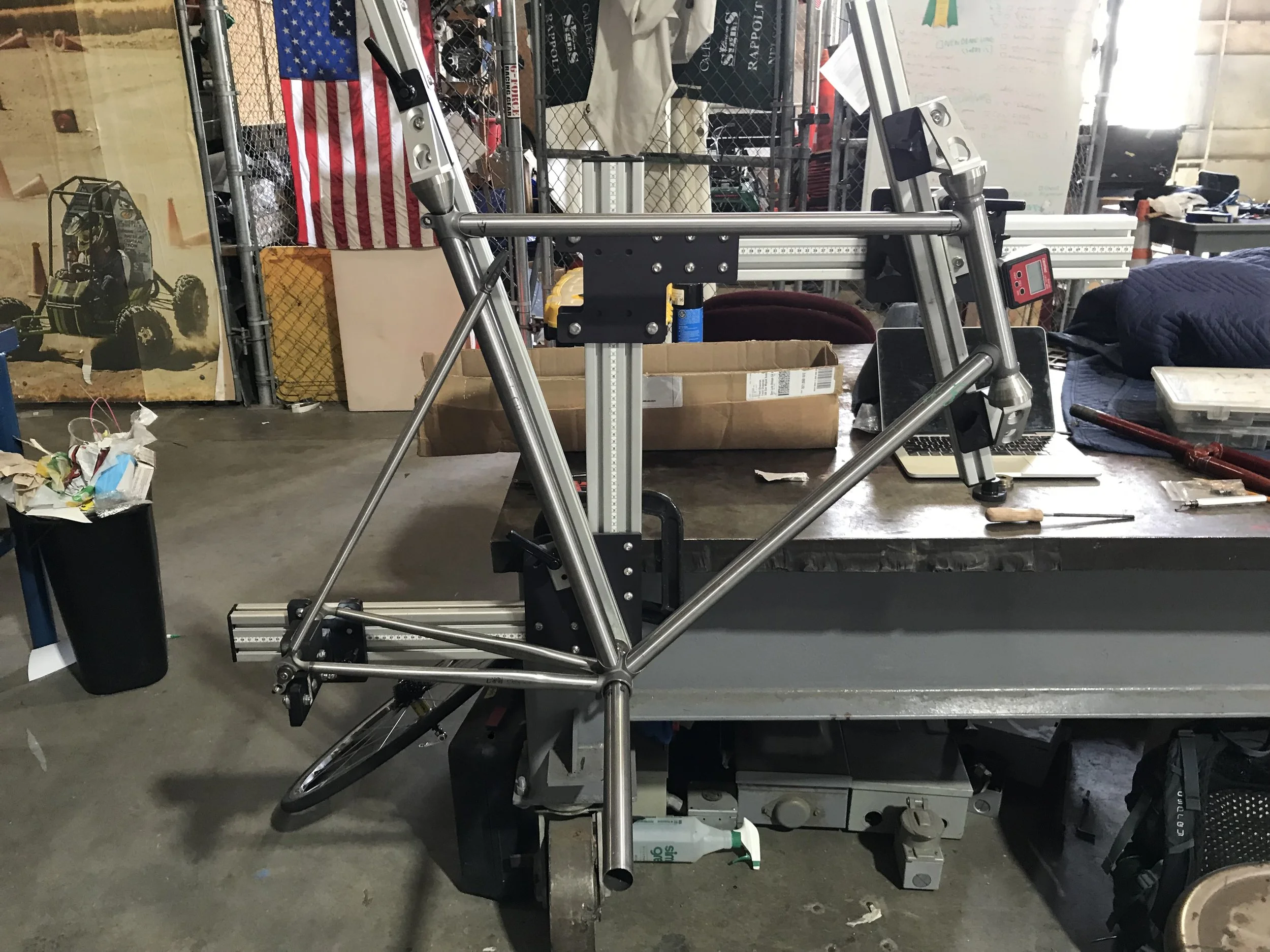 The steel frame tubing cut to size and placed in a device to hold the form of the bike during brazing of the joints using a silver solder.